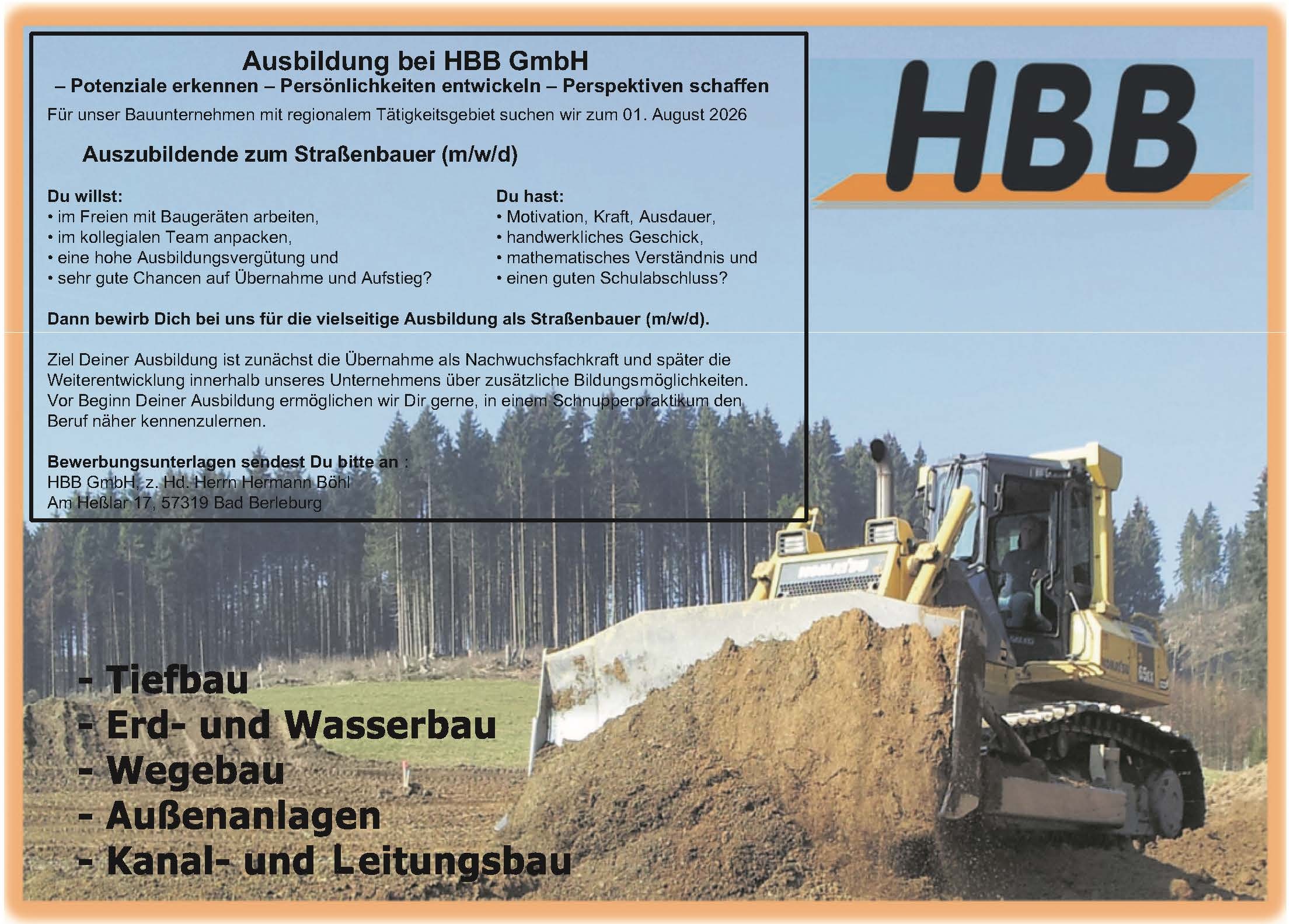 Die HBB GmbH wurde 2010 in Bad Berleburg gegründet und legt ihren Schwerpunkt auf Straßen- und Tiefbau, Erd- und Wasserbauarbeiten, Rohrleitungsbau von Ver- und Entsorgungsleitungen sowie den Wegebau. Als junges Unternehmen sind wir auf gut ausgebildete Fachkräfte angewiesen und suchen daher zur Verstärkung unseres Teams zum sofortigen Eintritt